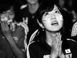 在与巴拉圭进行点球生死战中,一位日本球迷在祈祷