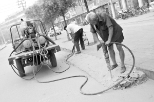 日前,在市区交通路上,市政工人正打掉道牙边多余的水泥坡道。据介绍,由于许多商户为方便自己,在各自门口前的道牙边铺设水泥坡道。长期以来,过多的水泥坡道不仅影响市容,还对堵塞道路排水功能。晚报记者 朱海龙 摄