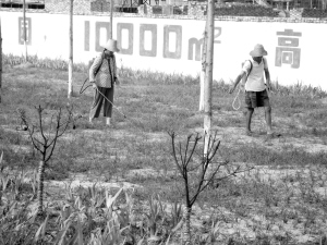 图1:7月6日下午,两名头戴草帽的园林工作人员手持喷雾器,顶着烈日在吉鸿昌将军纪念馆廉正公园清除杂草。