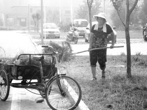 图2:7月7日下午,一名戴着遮阳帽、脖子上搭着毛巾的市政工作人员冒着高温清理垃圾。