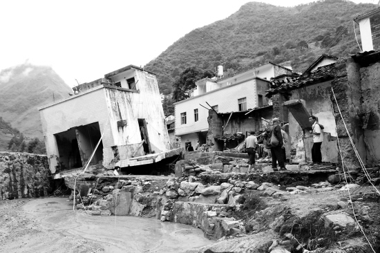 7月13日在云南昭通市巧家县小河镇拍摄的受损民房。7月13日凌晨4时左右,云南昭通市巧家县小河镇突降暴雨,山洪猛涨,山体滑坡。截至13日12时,发生在巧家县小河镇的洪涝灾害已造成当地15户民房倒塌,50余户受损,死亡4人,失踪42人,受伤53人。新华社发