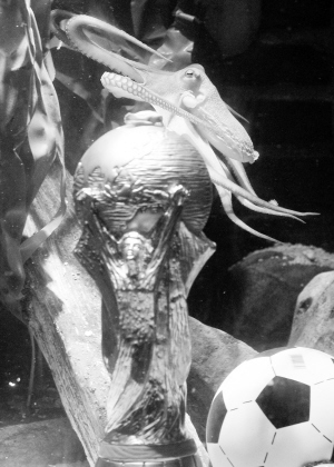 7月12日,在德国奥伯豪森水族馆内,章鱼保罗神气地盘踞在“大力神杯”模型之上。在本届世界杯期间,保罗因成功预测了全部七场世界杯德国队参加的比赛结果而声名鹊起,而它最后一场预测的西班牙夺冠也在决赛当天应验。