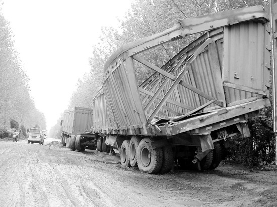 7月16日,一辆满载石子的大货车行至郸(城)淮(阳)公路郸城县汲冢镇黄楼段时,由于车身重达百吨、路面坑洼不平等因素,导致后节车箱变形、轮胎爆裂,石子散落一地,郸淮公路因此瘫痪30个小时。晚报记者 徐松 摄