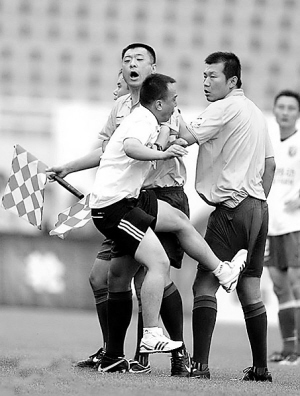 这一判罚引起了此前已经多次抗议裁判的青岛队球迷和教练组的不满。主教练郭侃峰,几名助理教练以及替补球员集体冲入场地,质问裁判的判罚。一名青岛队球迷趁乱从看台跳下,奔向球场中央,飞起一脚踹向主裁判王哲(如下图)。