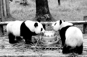 7月26日,准备赴澳门定居的大熊猫“蜀祥”(左)和“奇妙”在吃生日“蛋糕”。当日,准备赴澳门定居的大熊猫“蜀祥”和“奇妙”迎来两周岁生日,成都大熊猫繁育研究基地为他们举行了生日会。5月29日,国家林业局在成都宣布,中央政府赠送澳门特别行政区的一对大熊猫确定,成都大熊猫繁育研究基地谱系号为717的“蜀祥”和710的“奇妙”将赴澳门定居。新华社发