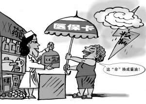 医保卡能干啥?答案谁都知道:看病买药。但日前记者接到读者反映,在广州的一些医保定点药店,只要一卡在手,酱油、毛巾、辣椒酱、牙刷牙膏,啥都能买,医保卡成了“购物卡”。漫画/王成喜