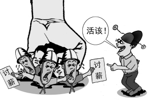 东莞市东城区“藏宝国际大酒店”拖欠装修工人工资,工人拉横幅讨薪,两工人被殴打。7月28日东城区政府信访办举行协调会,信访办主任叶柱权称工人挨打“活该”,还拍桌子骂女工人为“泼妇”,称工人拿不到工资是“交学费”。(7月29日《南方都市报》)