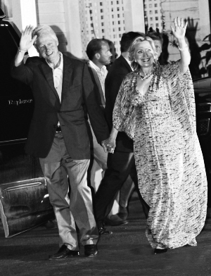 希拉里着蓝色长裙,笑容满面。克林顿着浅蓝衬衫,套深蓝西装,看上去也颇为高兴。希拉里向人群挥手致意后,两人迅速进入饭店。克林顿7月30日下午现身莱茵贝克,轻松回答一些公众提问。“恭喜,”周围人高呼:“我们爱你!”(据新华社)