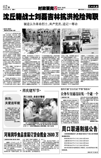 沈丘籍战士刘磊吉林抗洪抢险殉职