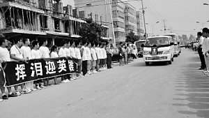 车队离开了送行的人们,透过车窗玻璃,看到送行人们久久没有离去,“勇士,一路走好”“英雄,永垂不朽”的条幅也逐渐在我眼前模糊……