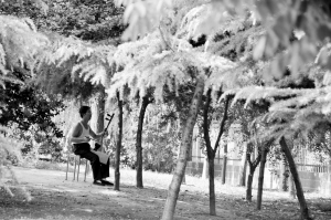 昨天,烈日当头,周口市区黄河路一树下荫凉处,一名男子拉着二胡自得其乐。