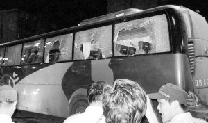上轮中超陕西中建浐灞做客大连,最终双方2比2握手言和。赛后大连球迷并没有向远征的陕西球迷握手言和,而是酿出了围堵球迷导致陕西球迷受伤的惨剧。当陕西球迷退出场外之时,大连主队球迷前来围堵。而陕西远征团的两辆大巴中停在显眼处的一辆已经遭到毒手,此时车上已经坐了20余名球迷。据前方球迷介绍,在警方将球迷护送过两三个十字路口之后,仍有部分球迷驱车追赶陕西球迷的大巴车。