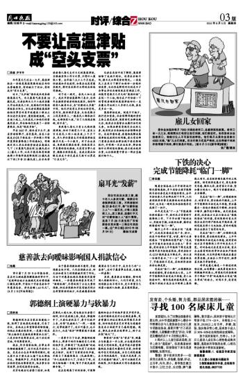 高温津贴发放,制度不可缺少,执行更加重要。社会保障问题的责任主体主要是政府,国家制定法律法规之后,政府应当监督企业履行法定的义务。如果法律没有规定企业的义务,政府则应当承担起社会保障的责任。这或许意味着,要想彻底解决高温津贴发放到位的问题,要么有关部门需要在相关法律法规中要求强制执行,并明确一旦企业失职,将会面临什么样的惩处措施;要么就由政府出资,从社保经费中拿出一部分直接拨付给个人。