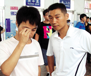 本报讯 商水县农家学子陈浩楠被美国名校芝加哥大学录取,攻读电子专业博士学位。8月7日,在周口火车站,陈浩楠一边依依惜别亲友,一边流着眼泪(如图)激动地说:“无论何时,我都不会忘记自己的根在周口。”