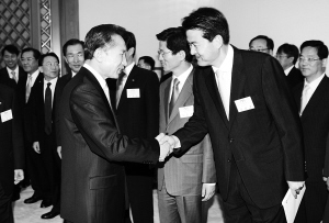 这是时任庆尚南道知事的金台镐(前右)与韩国总统李明博握手致意的资料照片(摄于2008年5月)。 新华社发