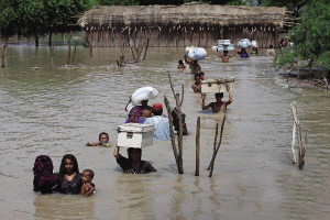 8月8日,在巴基斯坦信德省的苏库尔,村民在洪水中转移。今年7月下旬以来,巴基斯坦遭遇了70多年来最严重的洪涝灾害。据联合国救援机构估计,洪水已造成至少1600人死亡,65万间民宅被毁,1500万人受灾,400多万人无家可归。新华社发