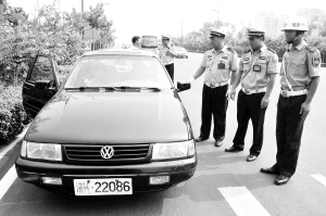 本报讯 昨日是全省军警联合整治行动暨第五次涉牌涉证专项整治集中统一行动日,我市交警支队和周口军分区成立联合行动小分队,在周口市区主干道的各个路口设立检查点,重点查处公务车、军警车交通违法行为。在迎宾大道上,市交警支队三大队民警和警备纠察人员查处了一辆假军车(如图)。