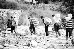 进入舟曲县政府所在地城关镇,刚走几步,就遇到几十个村民,步履匆匆地从身边经过。男女老少,形形色色,肩头的装备却几乎一模一样——敞口背篓,里面塞一个大水壶。背篓是破的,壶身是旧的,但壶里的水,个个装得满满当当。