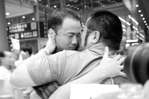 据介绍,由于翟田田是被直接送上飞机的,美国的朋友为其准备的新衣尚未来得及换上,身上穿的仍然是他入狱时穿的衣服。走出出站口后,翟田田的家人立即带他去更换一件黄色的新衣,这时翟田田的父亲翟泰山默默地走在他身后,止不住地哭泣。换好新衣后,他右手拥着父亲并肩向外走去,两人微笑交谈,翟田田还在父亲的脸颊上亲了一口(见上图)。
