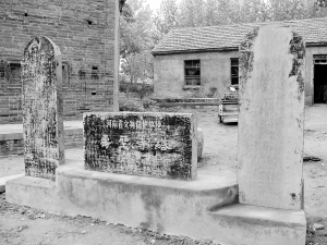 古塔第一级残存的石门楣上,有刻字4行:明道二年癸酉岁三月一日丙寅时戊寅日葬舍利院主僧**建**功德塔(“*”代不清的字)。这些记载成为塔体建筑最准确和最具历史真实的记录。第四级塔室北墙上有3尊石雕像。雕石两块并列镶嵌于墙上,靠东的一块正中雕有两尊佛像,东边一座为盘膝背面像,西边一座为盘膝正面像,靠西的一块正中雕有一座盘膝正面佛像,左右各刻有“佛心”、“供养”字样。