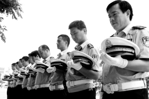 图③:昨日上午10时许,正在岗上执勤的市公安交警支队直属三大队的全体民警身着警服,面向甘肃舟曲方向静静伫立,低头默哀,表达对舟曲特大山洪泥石流灾害中遇难同胞的深切哀悼。