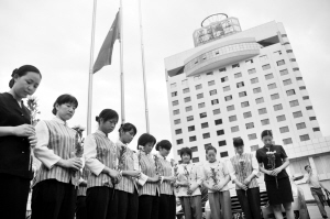 图①:昨天,周口饭店举行升国旗降半旗仪式,职工们手持黄色菊花为舟曲默哀,表达对在特大山洪泥石流灾害中遇难同胞的哀思。