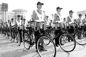 本报讯 步行去巡逻,太慢!开车的话,废油!怎么办?项城市公安局想出了高招:骑自行车,节能环保,还能深入小街小巷!8月13日上午,100名巡防队员骑着统一配有警灯、警棍和对讲机,上面印着“项城治安巡防”字样的警用单车亮相街头,引来市民关注的目光。