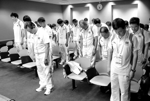 上午10时在位于南洋理工大学青奥村内的一间阶梯教室,一条白底黑字的横幅上醒目写着“沉痛哀悼甘肃舟曲遇难同胞”。在代表团团长蔡振华带领下,参加哀悼活动的38名工作人员、运动员代表为遇难同胞进行了1分钟的默哀仪式。