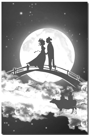 入夜,奶奶带我们打扫庭院,然后是净脸净身。待夜已静、月亮升起时,奶奶会在院中放一条几,几上放一大碗,盛满清水,让我们跪拜,名为乞月。叩头过后,奶奶会给每人一针一线,让我们在昏黄的月光下纫针,穿不过的,懊恼连连;偶有侥幸成功的,则大喜过望,以巧姐之名博得众人艳羡。接下来,便是数年如一日的故事讲述。牛郎织女的故事虽早已听得烂熟,但在七夕之夜听奶奶娓娓道来,则别有一番滋味,讲到老牛开口讲话时,我们照样会惊奇;讲到王母娘娘划出银河时,我们会愤怒;讲到七夕鹊桥会时,我们也会欣慰。也有性急的孩子,等不到故事讲完,便早早躲进丝瓜架下,竖起耳朵、屏住呼吸,偷听牛郎织女说悄悄话。