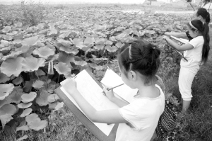 昨天,10多名小书画爱好者在老师带领下在淮阳龙湖景区画荷花。荷花节期间,龙湖荷花和秀美的自然生态环境吸引了我市不少书画爱好者前来写生。 晚报记者 杜欣 摄