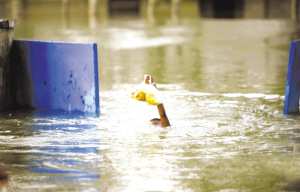 8月22日,一名巴基斯坦少年为了不让手中的食物被洪水打湿,艰难地在水中游动。