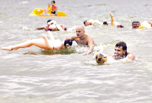 8月22日在俄罗斯新西伯利亚举行的“橡胶人游泳大赛”上,选手们抱着充气人奋力划水。