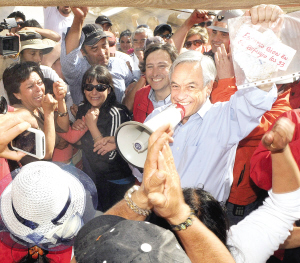 8月22日,在智利北部城市科比亚波附近,智利总统皮涅拉展示塌方铜矿被困矿工写的“我们全部33人仍然活着”的字条。皮涅拉当天向媒体宣布,救援人员的测深钻头达到地下688米处后,被困矿工将一张手写字条绑在钻头上,告诉救援人员,他们33人全部仍然活着。科比亚波市附近沙漠地带一铜矿5日发生塌方事故,33名矿工被困井下。