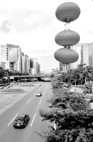 在深圳经济特区建立30周年之际,深圳市在深南大道、滨河大道等主干道上悬挂国旗、红灯笼,设立庆祝标语,迎接深圳经济特区30岁生日。 新华社记者 陈晔华 摄