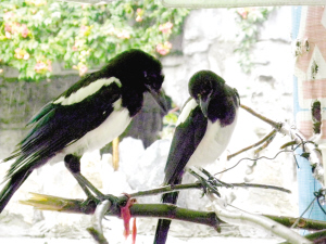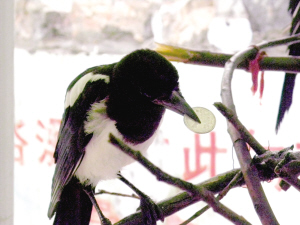 “‘小黑’‘小白’是‘小财迷’,有自己的‘小金库’呢!”申先生笑着说,“我在游乐园兼卖冷饮,有时生意忙,别人来买东西,‘小黑’‘小白’也忙着收钱,它们呀,叼着钱就藏到自己窝里。”果不其然,一见记者掏出一枚硬币晃了晃,喜鹊就两眼“放光”,张嘴就叼(图1)到自己窝里去了。