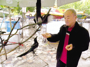 本报讯 见过有人养鹦鹉、八哥、百灵,可谁见过养喜鹊的?而且,喜鹊的主人不把鸟儿关在鸟笼里,而是散养在家里,如同“家人”一样和谐相处。昨日,记者在周口人民公园见到了养喜鹊的申宗保先生。申先生3个多月前救下的这对喜鹊不仅不怕人,还是“小财迷”,每天喜鹊在他肩头、手臂上跳来跳去的样子,吸引了许多前来公园游玩的市民驻足观看。