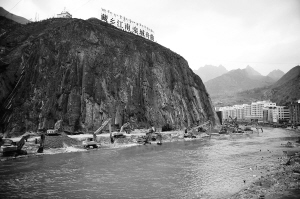 在舟曲县城江桥上游河段,解放军和武警部队昼夜不停对河道进行除险清淤(8月28日摄)。 新华社发