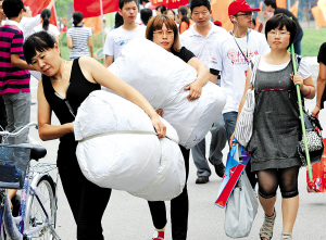 8月28日,家长在为孩子搬运行李。当日,南京东南大学4000多名新生报到入学,众多家长陪同前来,为孩子尽心忙碌。虽然学校和社会近年不断发出新生独自入学、培养独立能力的倡议,但家长对孩子考上大学的喜悦和执着的爱,让他们难却陪送的脚步,庞大的新生“亲友团”依然是大学校园迎新时节的一道风景。新华社发