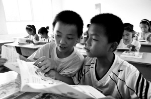 8月30日,四川省华蓥市明月小学的学生们在浏览刚领到的新教材。