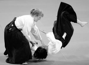 8月30日,澳大利亚选手在表演合气道。当日,2010年北京首届世界武搏运动会合气道项目在北京中国农业大学体育馆拉开帷幕。合气道是起源于日本的一种以巧制胜的近代武术,根源于日本大东流合气柔术,主要特点是“以柔克刚”、“借劲使力”、“不主动攻击”,讲究通过抓、投、锁、摔等技术达到自卫防守的目的。本届武搏会不设对抗比赛,只有表演,来自21个国家的70多名选手参加了上午的表演。