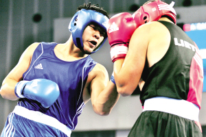 8月30日,中国选手张志磊(左)在比赛中。当日,在2010年北京首届世界武搏运动会拳击男子91公斤以上级四分之一决赛中,张志磊战胜立陶宛选手皮特卢斯科维尤斯,晋级下一轮。