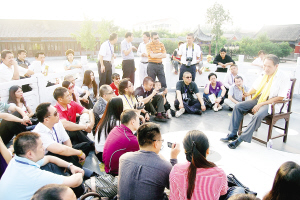 8月30日上午,在鹿邑县明道宫景区玄元殿前, 广州中山大学博学同学会河南商务慈善之旅的40多名企业总裁EMBA班硕士生,认真聆听河南省书画协会会员、《画说老子》一书作者王殿举讲解《道德经》。据了解,这40多名企业总裁EMBA班硕士生是在出席第六届中国河南国际投资贸易洽谈会后,特意到老子故里鹿邑问道悟德的。晚报记者 侯国防 通讯员 蒋保庆 摄