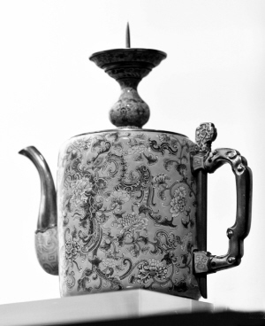 预展上展示的估价为2000万至3000万港元的清雍正御制金胎画琺瑯浅绿地“丹凤呈祥”图盖壶。