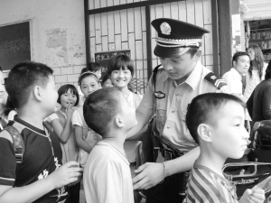 图为保安维护学生放学秩序