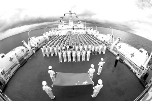 9月6日,“和平方舟”号医院船举行宣誓仪式。当日,经过连续多天的航行,前往亚丁湾海域及吉布提等亚非五国执行“和谐使命—2010”任务的中国“和平方舟”号医院船驶出国门。这是“和平方舟”号医院船首次穿越南海驶向大洋。428名官兵及医务人员全程参加这次为期87天的任务,总航程将达1.5万多海里。自8月31日驶离舟山码头后,医院船经受了“狮子山”“圆规”“南川”台风的考验,穿越台湾海峡、西沙群岛和南沙群岛,顺利抵达南海。新华社发