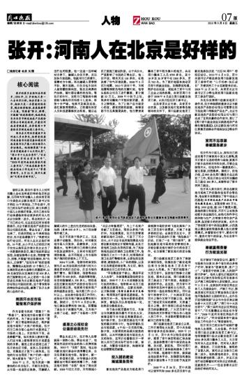 曾经以来,部分外省市人士对河南籍人会有这样或那样的偏见和误解,而同样为河南籍人士的共青团周口市委驻北京新发地团工委书记张开则在16年的创业、工作生涯中,用自己的实际行动来证明、树立和捍卫中原儿女的美好形象,用自己的实际行动来感染和带动更多的河南人把北京当做第二故乡。现在的张开,有了自己的公司,而且还担任河南省青联委员、北京市新发地农产品股份有限公司副总经理。事业有成了,荣誉也来了,但是回想起16年来的创业经历,张开还是感慨万千:“我要用实际行动证明:河南人在北京是好样的。16年前,从小不甘人后的张开两手空空从淮阳县许湾乡到北京当了一名普通的保安员,随后他还经营过饭馆、房屋装修等小生意。凭借着“努力、拼搏、不服输”的进取精神,和“先做人、后做事”、“信用为本”的经营理念,慢慢地从起初的10个绿化工人发展到现在的大型绿化苗圃园林、从28名保安队伍发展到目前500多人的正规管理公司、从之前的一名小保安成长历练为北京新发地农产品股份有限公司副总经理。这个看似简单的转变和成功过程,凝聚了张开太多的心血和汗水。