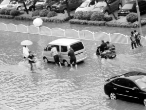 昨日,大雨后的周口市区七一东路一片汪洋,平常车载人,雨后人推车。
