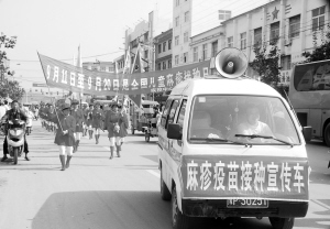 本报讯 9月11日,是全国8月龄至14岁儿童麻疹疫苗强化接种第一天,郸城县疾病预防控制中心采用多种形式,出动宣传车4辆,印制过街条幅近200幅,向社会发放宣传单10万多张,组织腰鼓表演队手举麻疹疫苗宣传条幅上街宣传。