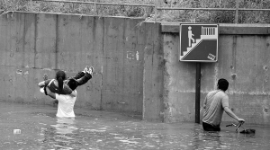 9月11日下午,杭州市滨江区火炬大道铁路涵洞内积水严重,行人涉水而行。受“莫兰蒂”影响,杭州市滨江区突降暴雨,该区内最大降雨量超过230毫米,为历史罕见。新华社发