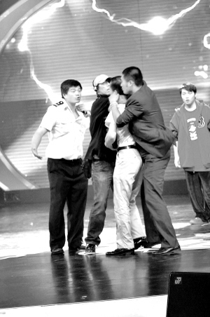 本报综合消息 上周日晚,《中国达人秀》东方卫视录制现场,女“大力士”陈静情绪失控,跑到舞台中央终止了节目录制,冲台下的评委狂吼,称该节目太假太虚伪,晋级与淘汰其实早就已经内定了,还向在场的观众称,决赛选手都给节目组塞了钱。保安与工作人员只能上台强行制止。突然,陈静的丈夫也冲到了台上,对着导演破口大骂。台下的三位评委周立波、伊能静、高晓松都被惊呆了。最后,周立波终于爆发了,让保镖上台把与导演扭打在一起的陈静丈夫拽到了场外。(东施)